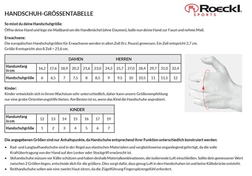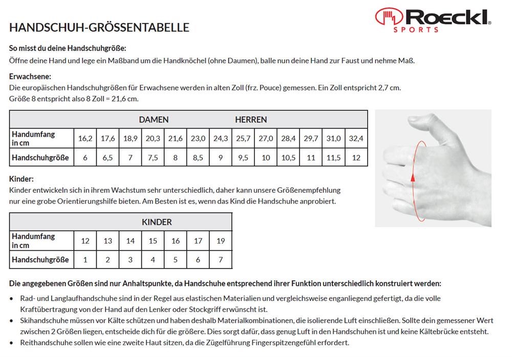 Das Maßband darf die Hand nur lose umschließen. Handumfang siehe Tabelle